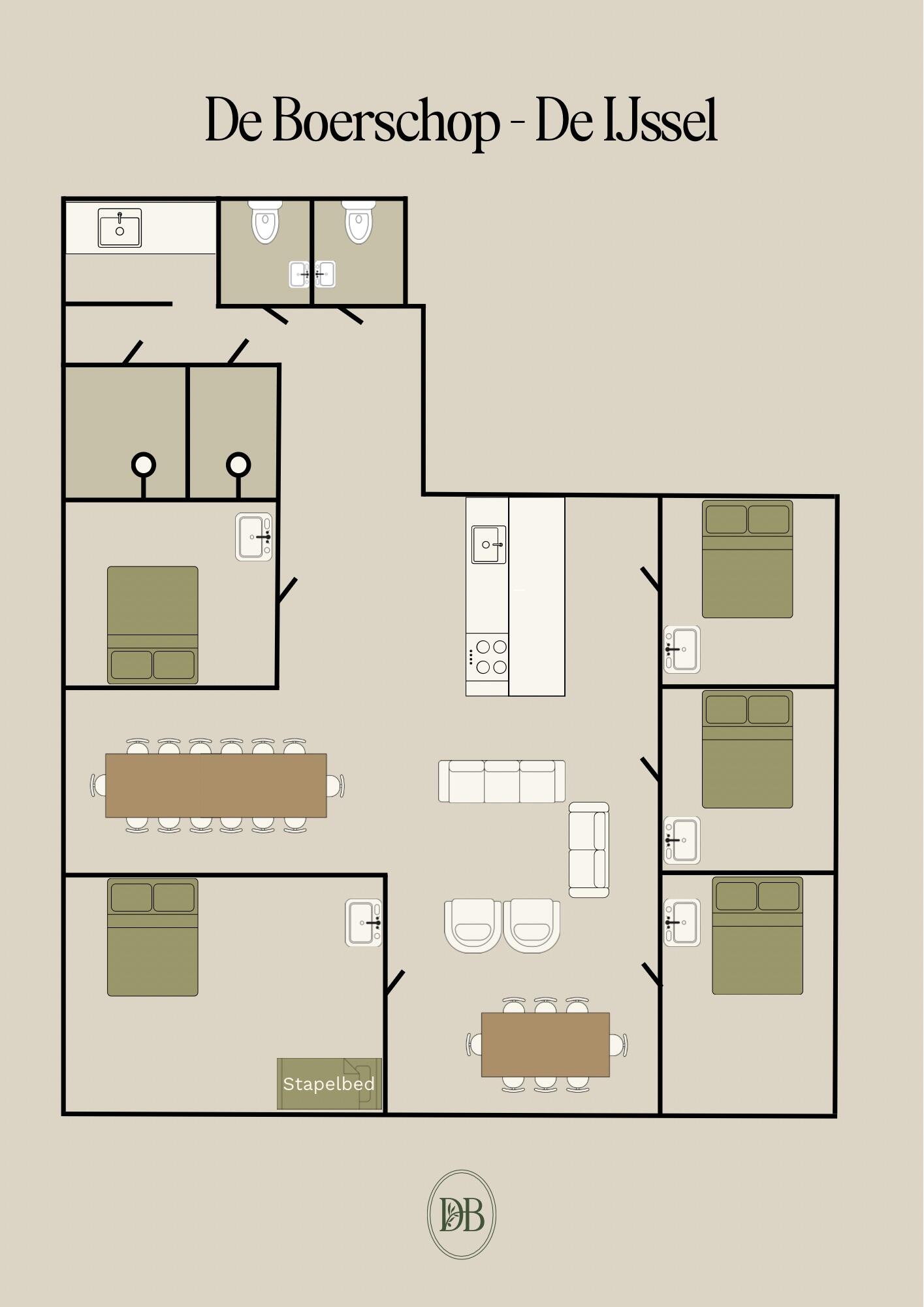 De slaapplaatsen zijn verdeeld over 9 slaapkamers, met wastafel en kastruimte, in de naast elkaar gelegen gebouwen IJssel/Vecht. In "de Deel" van groepsaccommodatie de IJssel zijn 2 douches en 2 toiletten. Ook zijn er 5 toiletten waar u gebruik van kunt maken, maar ook de gasten van het restaurant. In groepsaccommodatie de Vecht zijn 2 douches en 2 toiletten.