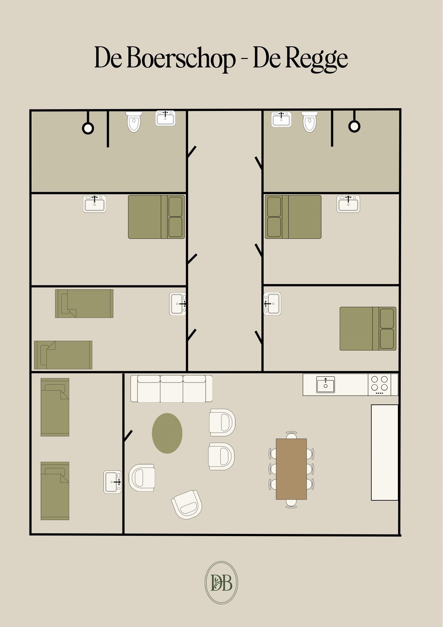 De 5 slaapkamers hebben ieder 2 één-persoons bedden, waarvan 2 1 persoons hooglaag bedden, wastafel en kastruimte. De boerderij heeft 2 ruime badkamers met toilet, douche en wastafel., en 1x baby verschoontafel Deze is extra ruim voor mensen met een beperking.